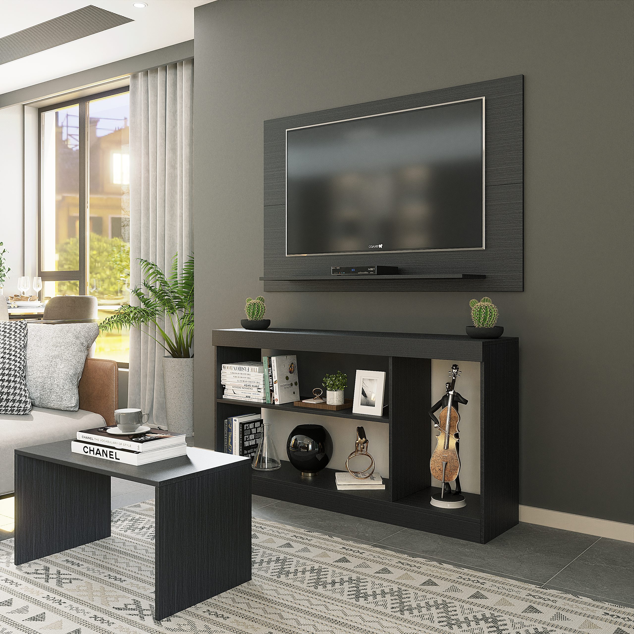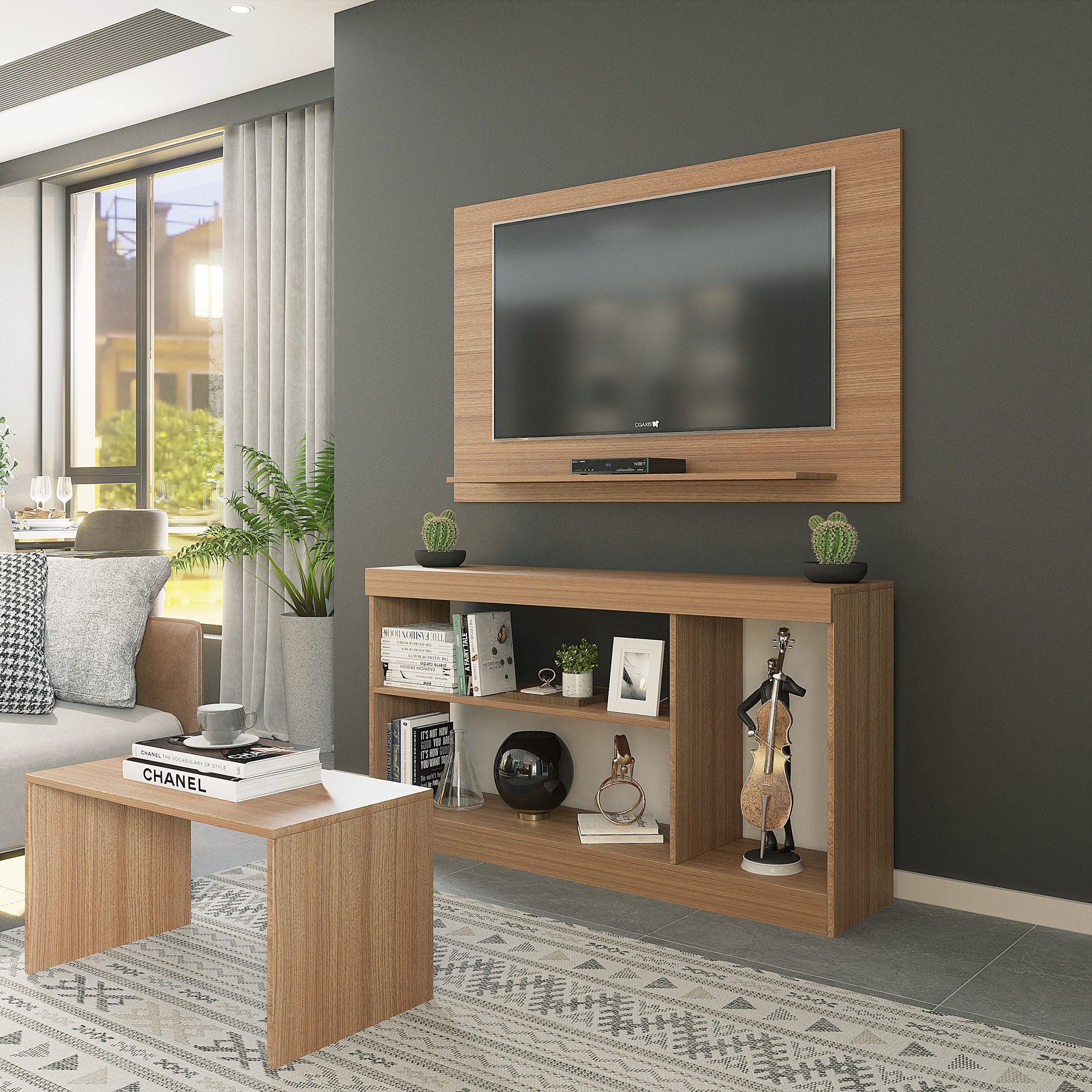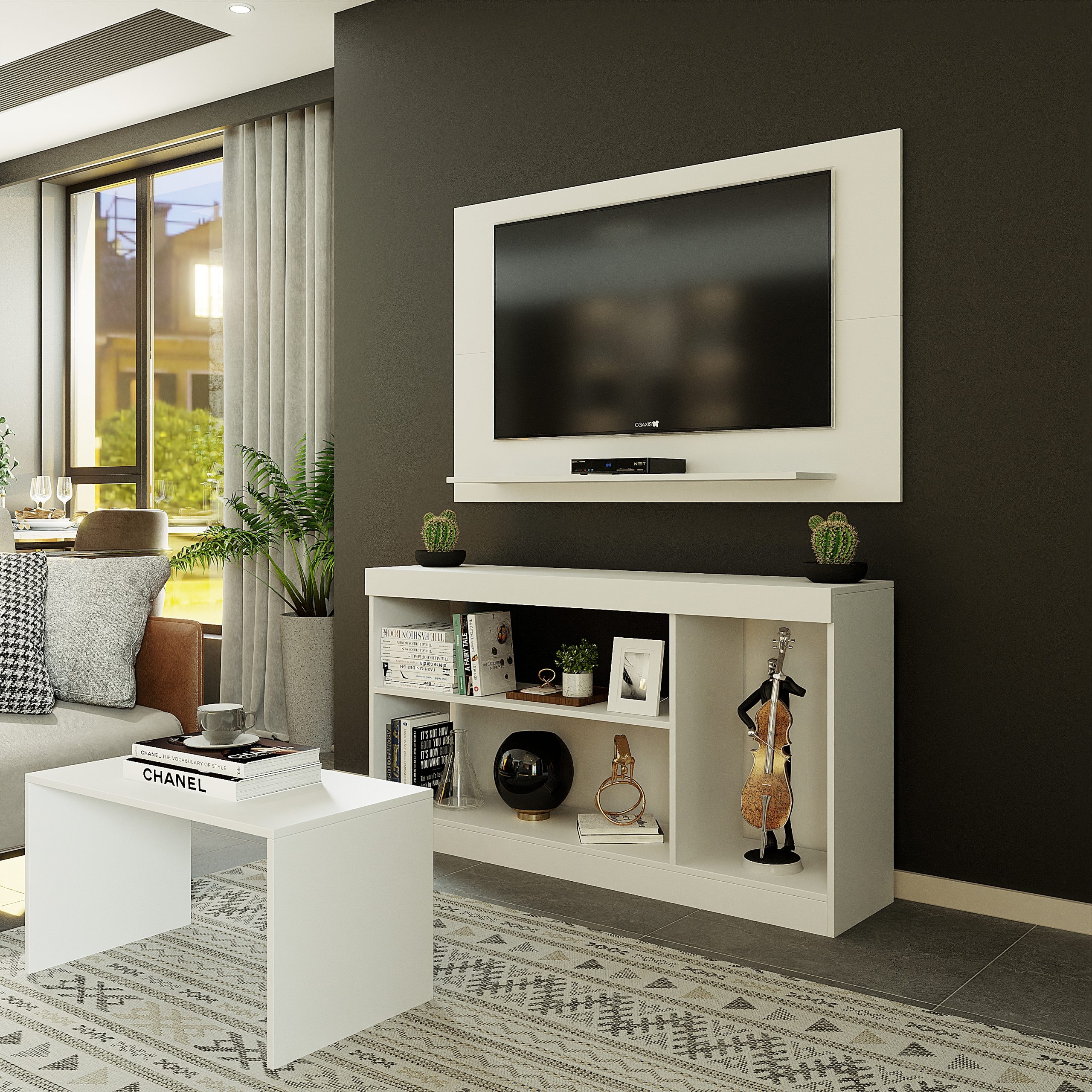 Conteúdo da embalagem: 01 Painel para TV + 01 Mesa de Centro + 01 Rack + kit de ferragens + manual de montagem